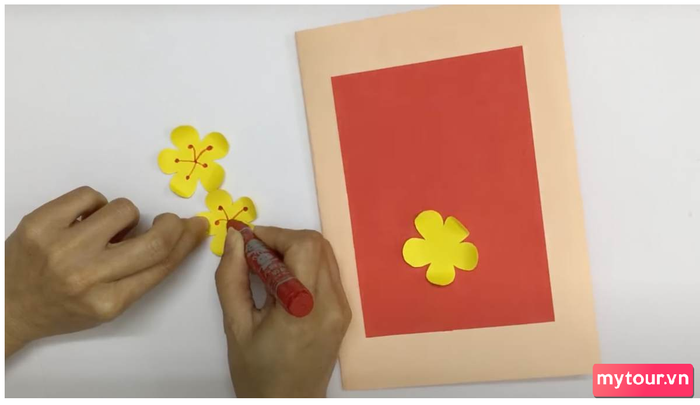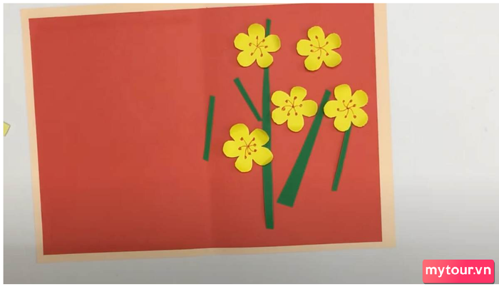 - Bước 7: Sử dụng những hoa mai còn dư để trang trí bìa thiệp ngoại vi.