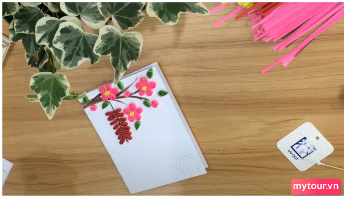 - Bước 4: Sử dụng keo để dán những chiếc lá lên tấm thiệp, và bạn đã hoàn thành cách làm thiệp Xuân 3D bằng giấy cuốn một cách đơn giản.
