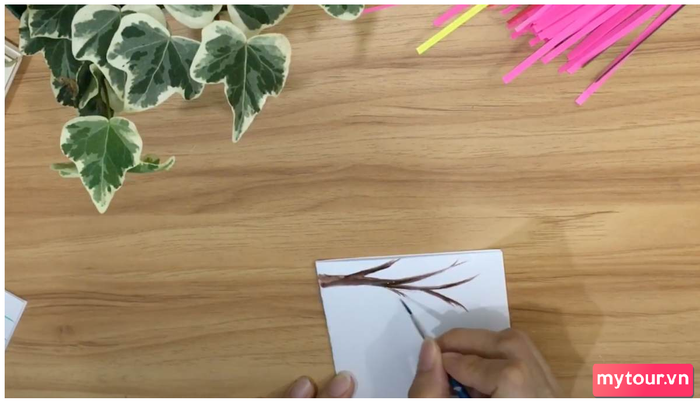 Bước 4: Sử dụng giấy màu A4 xanh lá cây để tạo hình lá và cành cây mai.