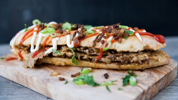 The meat used can be pork, beef, or chicken. When served, Roti John is often sliced for convenient consumption and dipped in chili sauce.