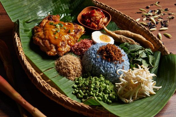 The uniqueness of Nasi Kerabu lies in its distinctive blue color, accompanied by herbs, dried coconut, spicy sauce, and fish sauce. Eating it the traditional way involves using your hands instead of a spoon.