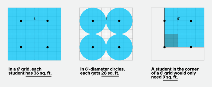 Giải thích được đưa ra trong kế hoạch mở cửa lại của quận tôi chỉ làm mọi thứ trở nên khó hiểu hơn. Lựa chọn 44 feet vuông, nó nói, sẽ cho phép “ba feet không gian cá nhân và một bán kính 6 feet” xung quanh mỗi đứa trẻ. OK, vậy làm thế nào có thể kết hợp những yêu cầu đó để đạt được 44? Trong lưới các ô vuông cách 9 feet, mỗi học sinh sẽ có 81 feet vuông. Trong việc lát gạch các vòng cách 9 feet, họ sẽ mỗi người cần 64 feet vuông.