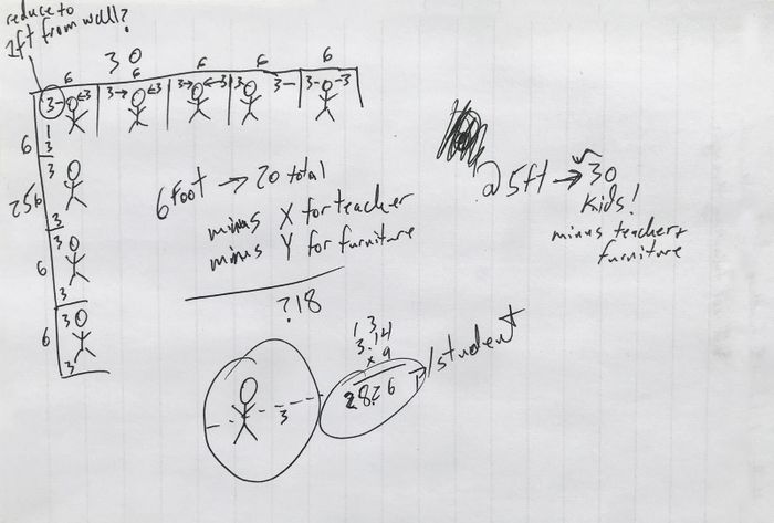Khi tôi liên lạc với quản lý cơ sở vật chất và quản trị viên trong một số quận đã bao gồm yêu cầu 44 feet vuông trong kế hoạch mở cửa lại của họ, họ thông báo cho tôi rằng họ thực sự không quan tâm đến toán học này. Thay vào đó, họ chỉ đi vào các lớp học với thước đo dây và cố gắng đặt càng nhiều bàn làm việc càng tốt, cách nhau 6 feet.