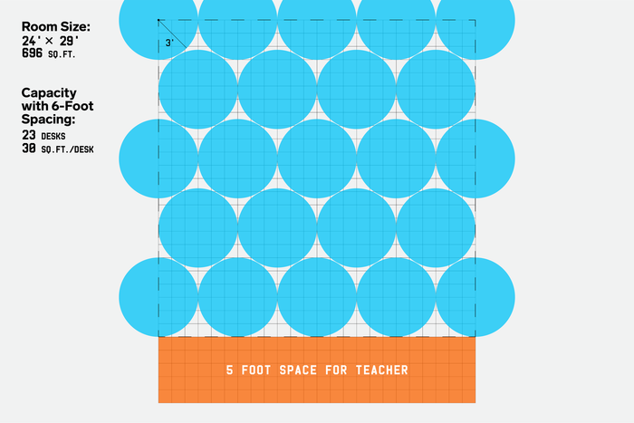 Khi tôi đòi hỏi thêm chi tiết, Filardo đưa tôi liên lạc với David Sturtz, giám đốc điều hành dịch vụ đánh giá cho Cooperative Strategies. NCSF đã mời Sturtz tham gia để giúp phát triển hướng dẫn Covid-19, vì vậy tôi viết thư cho anh ấy và hỏi liệu anh ấy có thể giải thích bí ẩn không. “Không vấn đề,” anh ấy trả lời, “đây là cách tôi đưa ra con số ban đầu đó.” Sturtz cho tôi biết rằng anh ấy đã bắt đầu với một lớp học trung bình có 696 feet vuông không gian sử dụng, có vẻ tương ứng với một với kích thước 29 x 24. Sau đó, anh ấy đã dành một dải rộng 5 feet ở phía trước của phòng cho giáo viên, để lại một khu vực 24 x 24 cho học sinh, bao gồm 576 feet vuông. (Anh ấy không trừ bất kỳ không gian nào cho đồ đạc lớp học.) Cuối cùng, Sturtz nói, anh ấy đã gán mỗi học sinh một hình tròn với bán kính 3 feet, để tính đến khoảng cách xã hội 6 feet. “Trong cấu hình phòng này,” anh ấy viết, “bạn có thể đặt 16 bàn.” Bây giờ chia diện tích ban đầu của phòng 696 feet vuông cho 16 và bạn sẽ có 43.5 feet vuông cho mỗi bàn, làm tròn lên thành 44. Voilà?