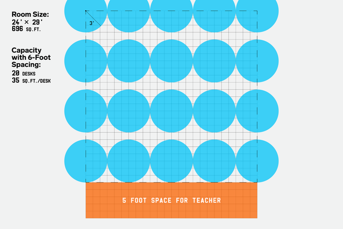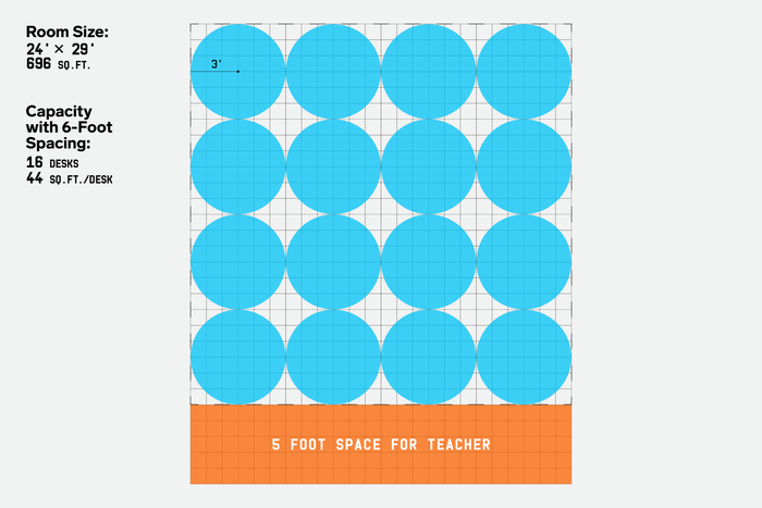 Tôi xem lại điều này với biên tập viên của tôi tại MYTOUR, một lần nữa làm rối bời. Hãy bỏ qua dải của giáo viên một lát: Nếu bạn chia diện tích của học sinh là 576 feet vuông cho 16, bạn sẽ có 36 feet vuông cho mỗi học sinh. Nói cách khác, Sturtz không phải đã tặng mỗi đứa trẻ một hình tròn với bán kính 3 feet—anh ấy đã tặng mỗi đứa trẻ một hình vuông 6 feet. Hơn nữa, phép tính của anh ấy chỉ hợp lý nếu bạn giả sử rằng mỗi đứa trẻ phải được giữ ít nhất 3 feet xa nhất từ tường gần nhất, giữ khoảng cách xã hội từ các tủ và kệ sách. Nếu bạn làm lại đánh giá mà không có hạn chế đó—đặt tất cả trẻ em giữa các ô lưới, cách nhau 6 feet, nhưng cho phép một số ngồi gần tường—thì bạn có thể chật thêm bốn bàn vào phòng. Bây giờ, với 20 học sinh hiện diện, mỗi người chỉ cần trung bình 35 feet vuông thay vì 44.