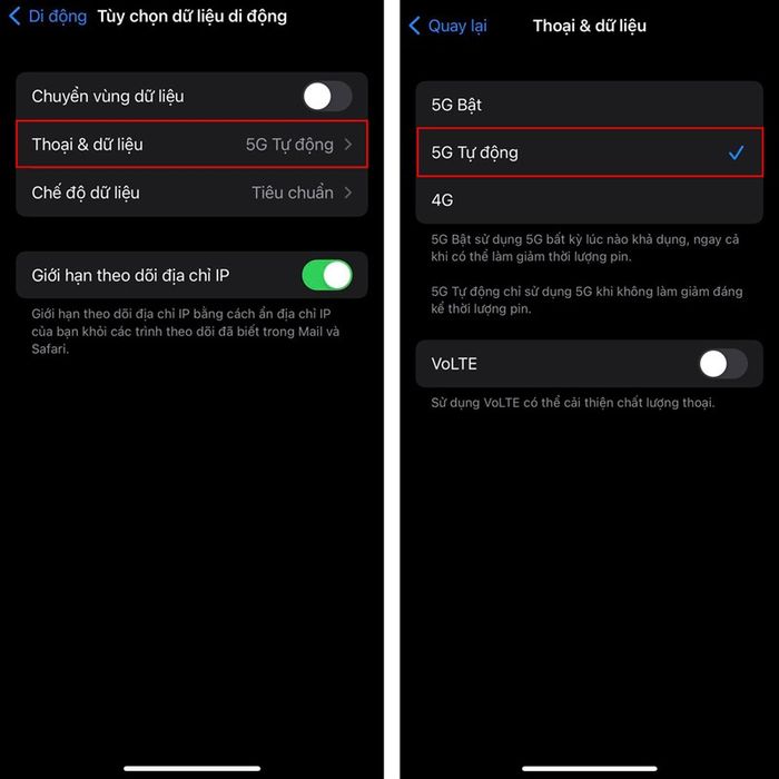 Bước 2: Kế tiếp, hãy chọn Âm thanh & Dữ liệu > Cuối cùng, tích vào 5G Tự động để khi bật dữ liệu, iPhone sẽ tự động sử dụng mạng 5G.