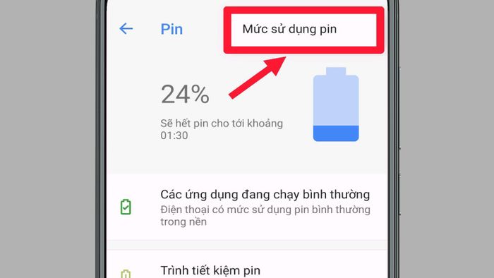 Bước 3: Chọn Mức sử dụng pin tại biểu tượng dấu ba chấm (góc trên bên phải màn hình).