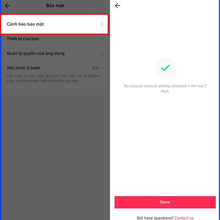 Trong TikTok, có một tính năng cho phép bạn kiểm tra hoạt động bất thường trên tài khoản của mình chỉ với một cú chạm. Hãy truy cập vào trang cá nhân của bạn > chọn biểu tượng menu 3 gạch ngang > Cài đặt & Quyền riêng tư > Bảo mật > Cảnh báo bảo mật và đợi một chút, kết quả sẽ hiện ra cho bạn.