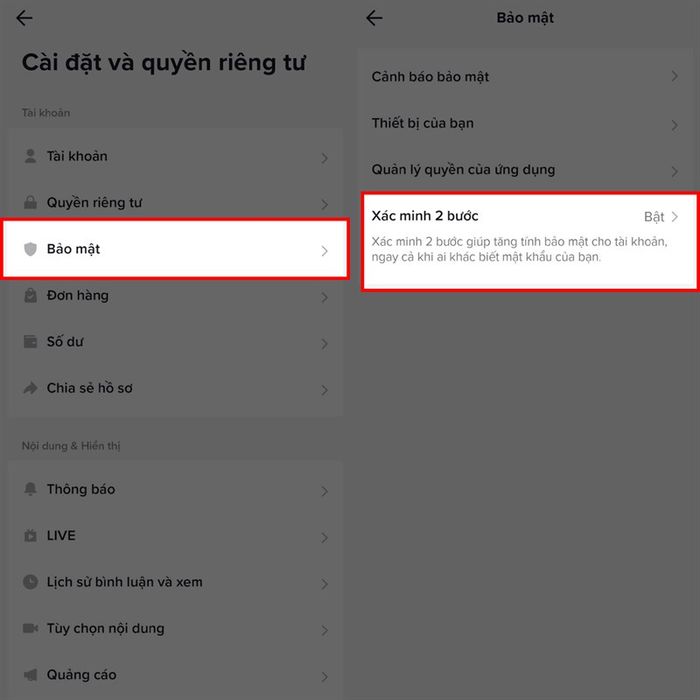 Sau đó, chọn tiếp vào mục Bảo mật > Xác minh hai bước. Bạn cần chọn hai phương thức xác minh, có thể là qua tin nhắn SMS và mật khẩu hoặc qua email và mật khẩu hoặc cả hai. Tiếp theo, nhập thông tin cần thiết và hoàn tất quá trình xác minh.