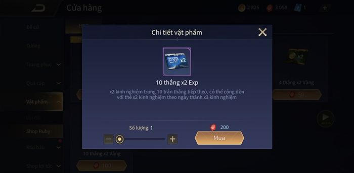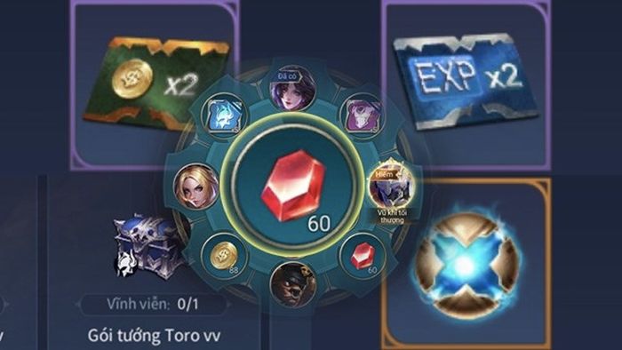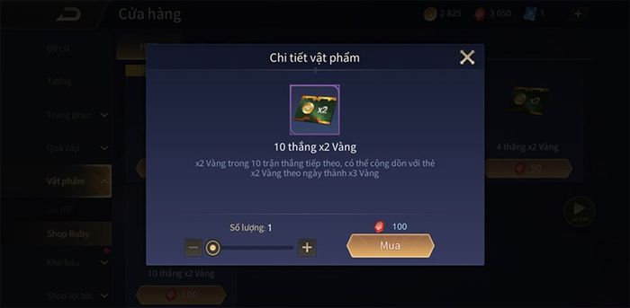 Trong cửa hàng Vật phẩm, sử dụng Ruby để mua thẻ x2 vàng sau mỗi trận đấu. Điều này giúp bạn tích lũy lượng vàng đồ sộ, mua tướng và nâng cấp bảng ngọc cho mọi vị trí trên bản đồ. Bạn có thể sử dụng chỉ từ 50 Ruby cho 1 thẻ hoặc tính toán để mua thẻ gấp đôi vàng hợp lý mỗi ngày.