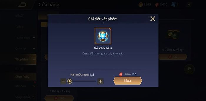 Tham gia sự kiện để nhận vé quay kho báu và tích lũy Ruby hàng ngày để mua vé quay siêu cấp, đem về những vật phẩm quý giá từ tướng đến mảnh ngọc mà không tốn vàng và thời gian nhiều.