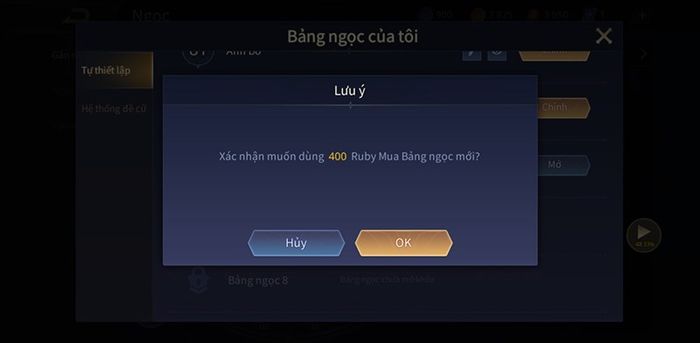 Mỗi vị trí tướng đều yêu cầu các bảng ngọc khác nhau. Sử dụng Ruby để mở bảng ngọc chỉ từ 400 Ruby. Bạn có thể trang bị mỗi tướng với bảng ngọc khác nhau hoặc tùy thuộc vào vị trí chiến đấu, chẳng hạn như bảng ngọc cho tướng phép, tướng vật lý, và tướng AD cho đường giữa.