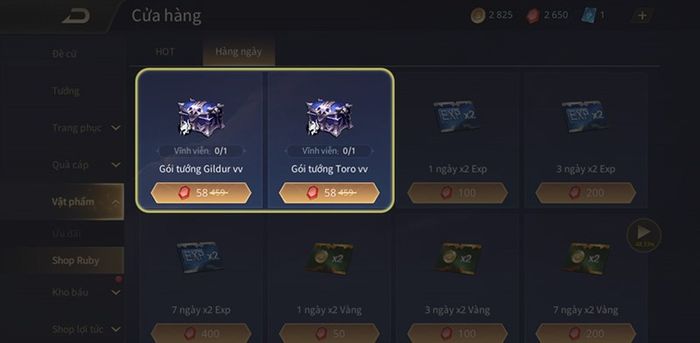 Ngoài việc dùng vàng để mua tướng, bạn có thể sử dụng Ruby tại Shop Vật phẩm để sở hữu các gói tướng cơ bản Toro, Gildur chỉ với 50 Ruby mỗi gói.