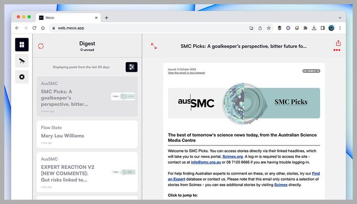 Meco chủ yếu hoạt động trên web, mặc dù cũng có sẵn ứng dụng iOS, và bất kỳ bản tin nào không được nhận diện tự động có thể được thêm vào bằng cách thủ công. Bạn có thể nhanh chóng sắp xếp bản tin dựa trên ngày nhận, nhảy đến các bản tin bạn chưa đọc, và thậm chí khám phá các bản tin mới thông qua Meco.
