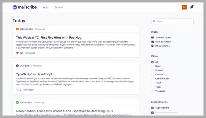 Hầu hết các ứng dụng quản lý bản tin hoạt động bằng cách rút các đăng ký bản tin của bạn ra khỏi hộp thư đến và chuyển sang một định dạng dễ dàng hơn để theo dõi, giống như Mailscribe. Mailscribe vận hành nền tảng marketing email riêng của mình, nhưng nó cũng cung cấp một trình đọc bản tin miễn phí mà bất kỳ ai cũng có thể sử dụng.