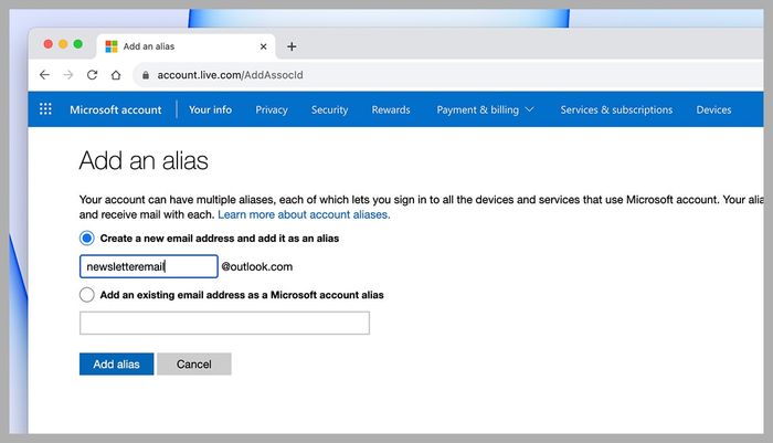 Ví dụ, đối với một tài khoản Outlook trên web, hãy truy cập trang địa chỉ email thay thế trong trình duyệt của bạn (bạn có thể cần đăng nhập vào tài khoản Microsoft của bạn trước). Chọn Thêm Email, và bạn sẽ được nhắc nhập địa chỉ email mới, sau đó có thể được quản lý qua tài khoản chính của bạn.