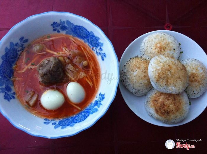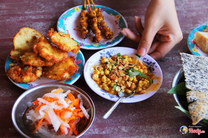 Không giống bánh căn ở Đà Lạt, bánh căn Phan Thiết mang hương vị đặc trưng của cá kho, trứng và xíu mại. Nước mắm chấm được pha có màu đỏ sậm, ăn cay cay đã cực. Ngoài ra, ăn kèm còn có xoài và khế băm nữa nên ăn hoài mà không thấy ngán nè.