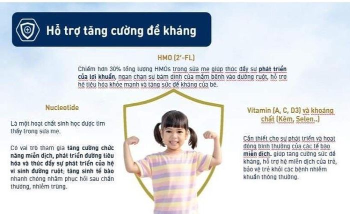 - Vi khuẩn có ích được thúc đẩy phát triển và hệ miễn dịch được duy trì khỏe mạnh nhờ vào sự tăng cường đề kháng từ HMO (2′-FL). Ngoài ra, nucleotid cùng với các vitamin (A, D, C) và khoáng chất (selen, kẽm) có vai trò tăng cường sức đề kháng cho trẻ.