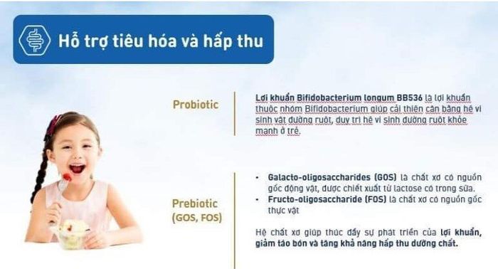 - Chất xơ hòa tan Probiotics & Prebiotics (GOS) giúp trẻ có khả năng hấp thu và tiêu hóa tốt hơn, đồng thời thúc đẩy sự phát triển của vi khuẩn có lợi cho hệ tiêu hóa của trẻ.