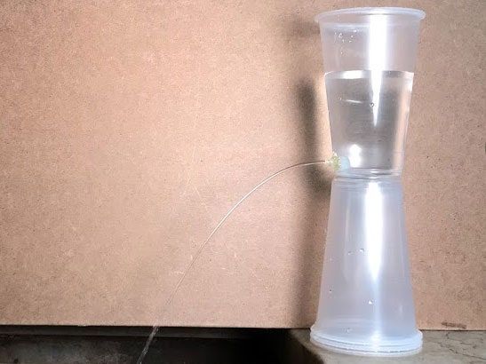 Nếu bạn không muốn rút ống nước, bạn cũng có thể làm điều này với một cốc hoặc một lon. Hãy thử đặt một lỗ nhỏ gần đáy cốc và sau đó đổ nước vào. Nước sẽ bắn ra theo hướng ngang, giống như chuyển động ném. Nhưng phần thú vị của bài thể hiện này là tốc độ ban đầu của nước rời khỏi cốc phụ thuộc vào độ sâu của nước. Khi nước rót đi, tốc độ "phóng" cũng giảm đi.