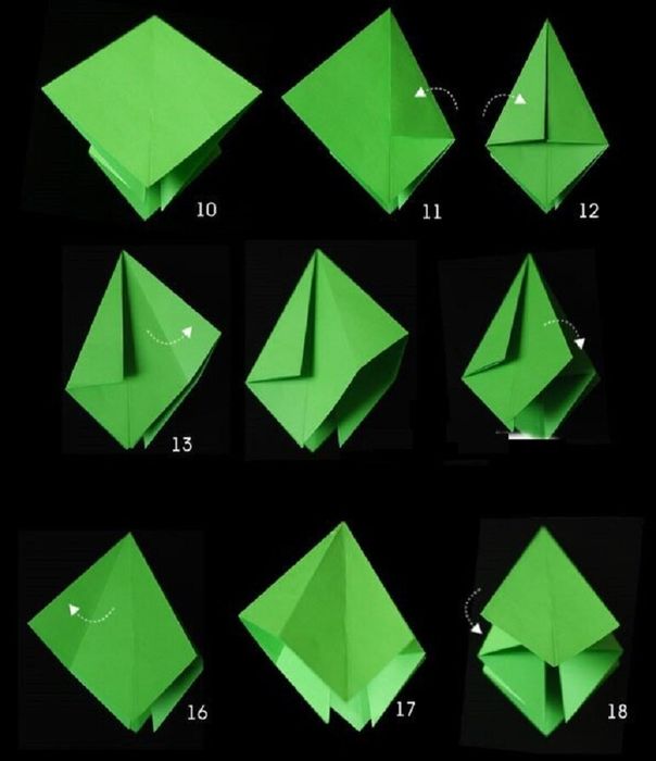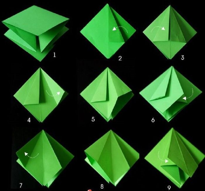 – Bước 2: Sử dụng tờ giấy vuông, gấp đôi theo đường chéo để tạo 4 tam giác. Mở giấy và gấp đôi nữa để chia vuông thành hai hình chữ nhật. Tiếp theo, gấp theo hướng ảnh mô tả.