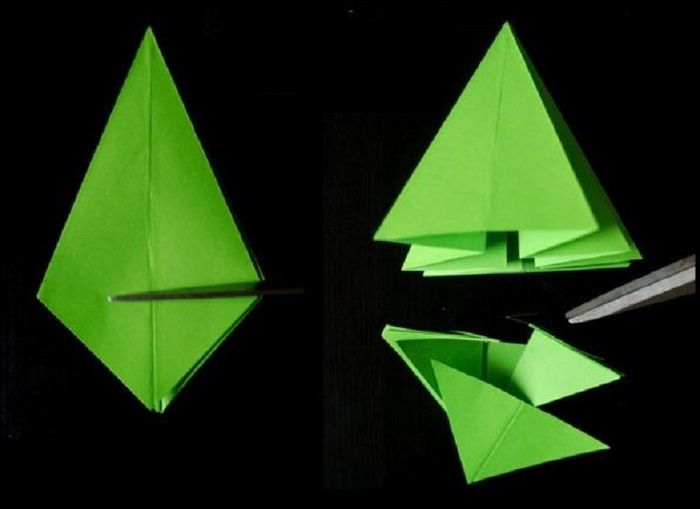 – Bước 5: Sử dụng kéo cắt hai bên của tam giác như hình dưới. Gấp những phần đã cắt thành các tam giác nhỏ liên tiếp. Lặp lại cho đến khi cả 6 cạnh, bạn sẽ có cây thông Noel xinh xắn.