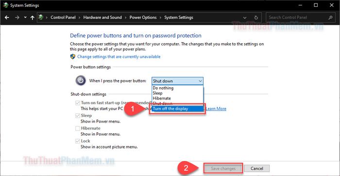 Bước 3: Trong phần When I press the power button, hãy lựa chọn Turn off the display. Đừng quên nhấn Save changes để lưu lại cài đặt.