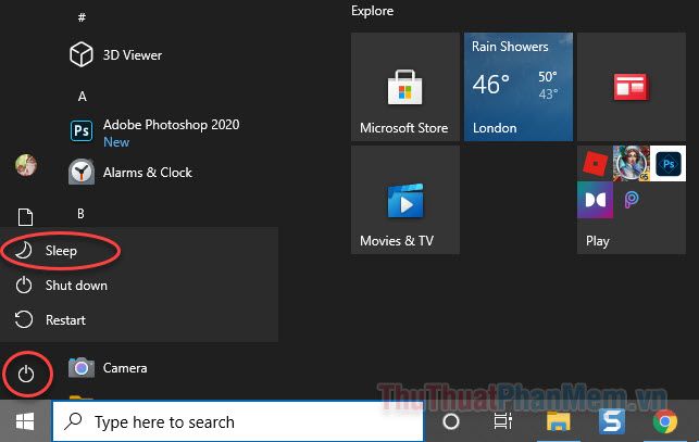 Bước 2: Bấm vào biểu tượng Nguồn và chọn Sleep để máy tính nghỉ ngơi, màn hình tắt đi như giấc ngủ bình yên.