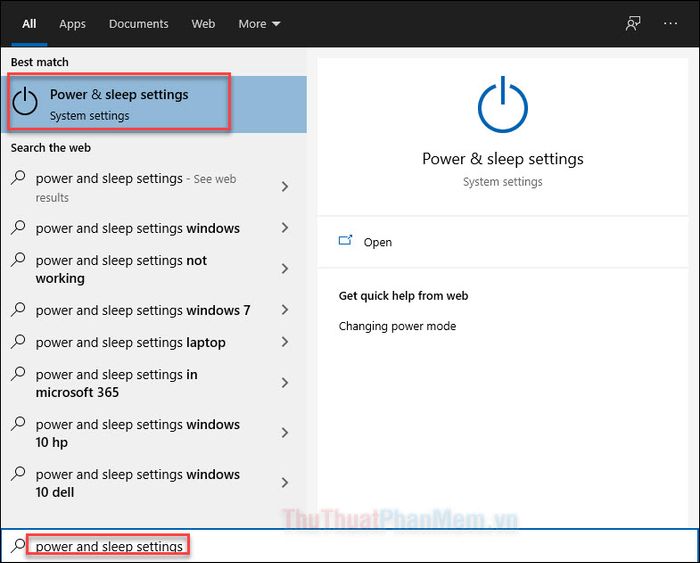 Bước 1: Mở tìm kiếm Windows và nhập từ khóa Power and sleep settings, sau đó chọn kết quả hiển thị.