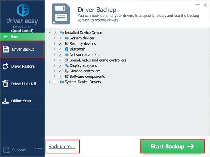 Bước 2: Trong danh sách, đánh dấu chọn tất cả các mục Installed Driver. Sau đó, chọn thư mục lưu sao lưu và bạn cũng có thể thay đổi đường dẫn bằng cách nhấn Sao lưu tới... Khi đã thiết lập xong, nhấn Bắt đầu Sao lưu để bắt đầu quá trình sao lưu driver.