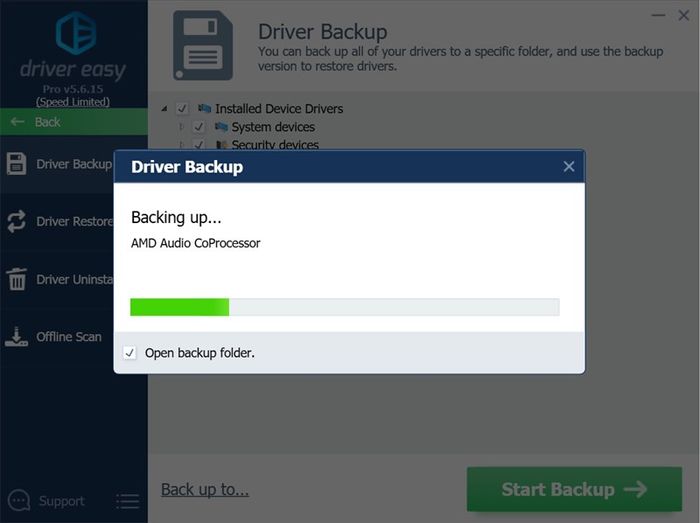 Nhấn vào mục Mở thư mục sao lưu để khi quá trình sao lưu hoàn tất, tiện ích sẽ tự động mở thư mục chứa các bản sao lưu Driver.