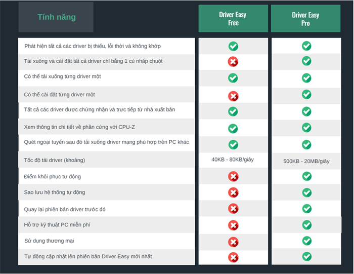 So sánh tính năng của Driver Easy Free và Driver Easy Pro