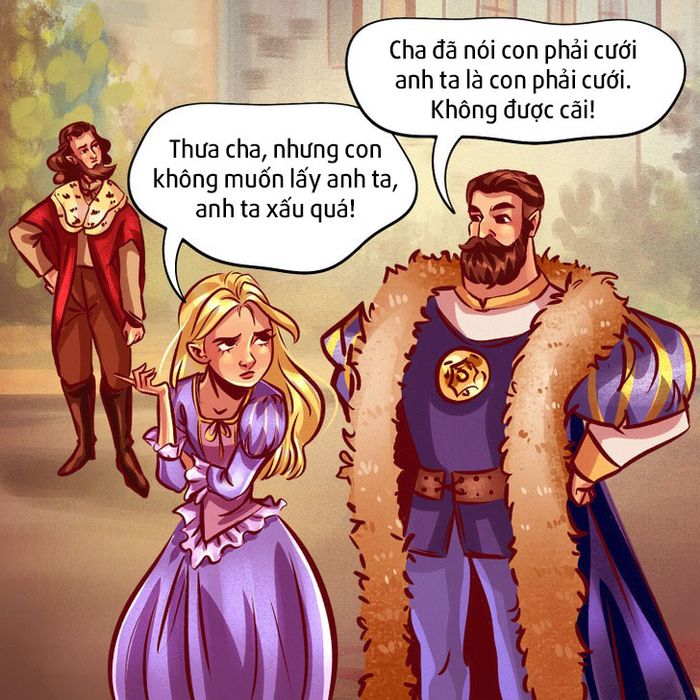 Nhiều vị vua trong truyện cổ tích thường không tôn trọng suy nghĩ cá nhân của con gái. Các công chúa thường bị ép kết hôn để tăng cường quyền lực của vương quốc, vì mục đích chính trị hoặc thậm chí không có lý do chính đáng. Rất may, trong truyện cổ tích, mọi thứ thường được giải quyết êm đẹp nhờ một phép màu nào đó.