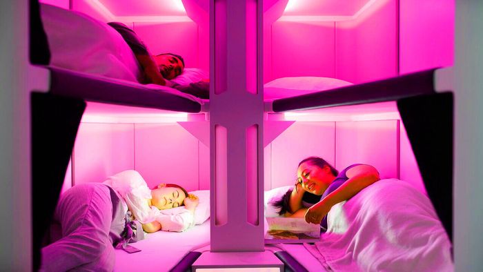Đúng vậy, tôi đang nói về các cái ốp ngủ của Air New Zealand. Mỗi đơn vị giường tầng có bề mặt giường riêng, chăn, rèm riêng tư, cổng sạc USB và hệ thống thông hơi.