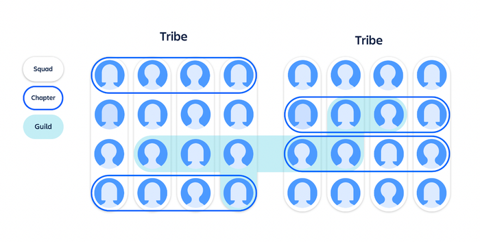 Image source: The Spotify model | AtlassianMỗi nhóm trong cùng một tổ chức hoạt động theo cách của họ. Tuy nhiên, mô hình Spotify khuyến khích Squads hợp tác trong việc đạt được các mục tiêu cấp cao. Khi nhiều Squads cùng nhau để đối mặt với mục tiêu cấp cao, cấu trúc nhóm tổng hợp đó được gọi là “Bộ tộc”.