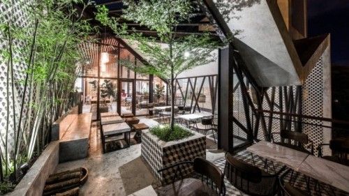 Với hiệu ứng dễ chịu từ sự kết hợp của tone màu trắng – xi măng và xanh. Tầng trệt của quán được trang trí với nhiều chậu cây xanh, tạo không gian mở và tường kính trong veo để nhìn ra tiểu cảnh bên ngoài. Còn các tầng trên là không gian ngoài trời xinh xắn, với những góc nhìn xuống phố.
