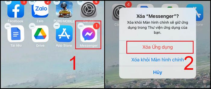 Bước 1: Nhấn và giữ vào biểu tượng Messenger > Bấm vào dấu trừ trên biểu tượng ứng dụng > Chọn Xóa Ứng dụng > Xóa.