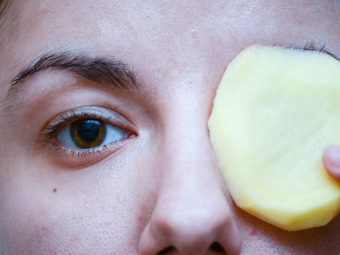 - Chia khoai tây thành miếng nhỏ và đặt lên mắt trong khoảng 10-15 phút.