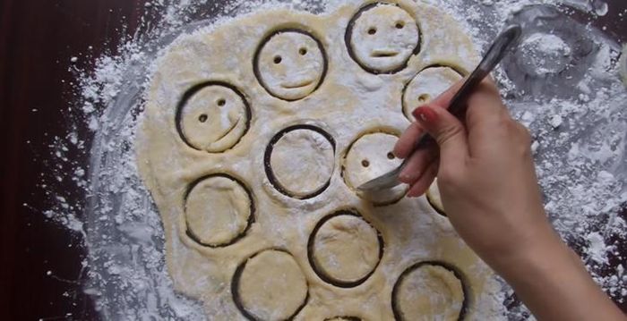 - Sử dụng miệng ly ấn mạnh xuống để tạo hình tròn, rồi dùng ống hút hoặc đũa ấn để tạo mắt. Dùng đầu muỗng ấn để tạo hình mặt cười, mặt mếu,...