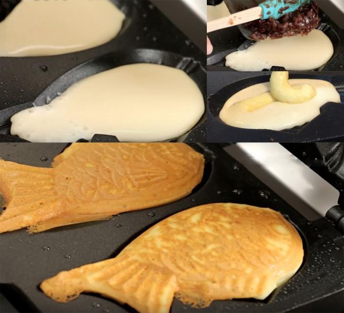 - Đổ bột vào khuôn đến 60% rồi dừng lại, chỉnh lửa vừa. Thêm nhân đậu đỏ hoặc kem sữa vào giữa, rót thêm bột để phủ kín, đậy nắp lại.