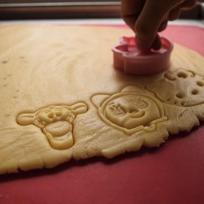 - Dùng khuôn cắt bánh quy hình thú ấn lên bột để tạo hình.