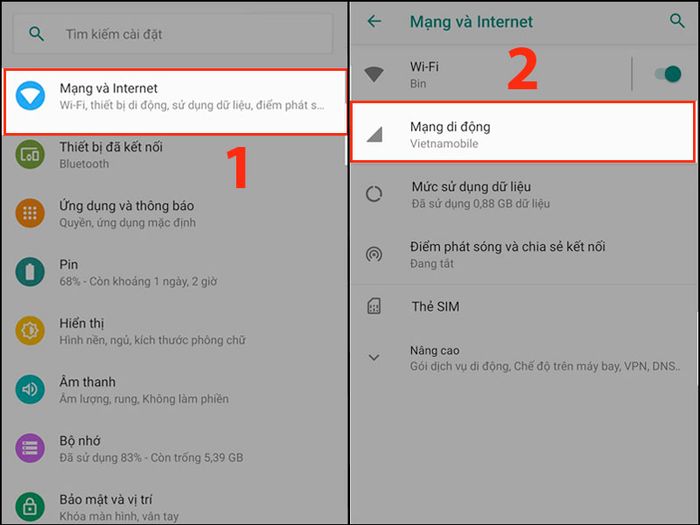 Bước đầu, mở Cài đặt và chọn Mạng và Internet > Mạng di động.