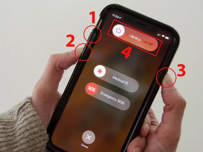 Chỉ cần giữ nút nguồn và nút giảm âm lượng cho đến khi logo Apple hiển thị > Trượt để tắt nguồn (slide to power off).