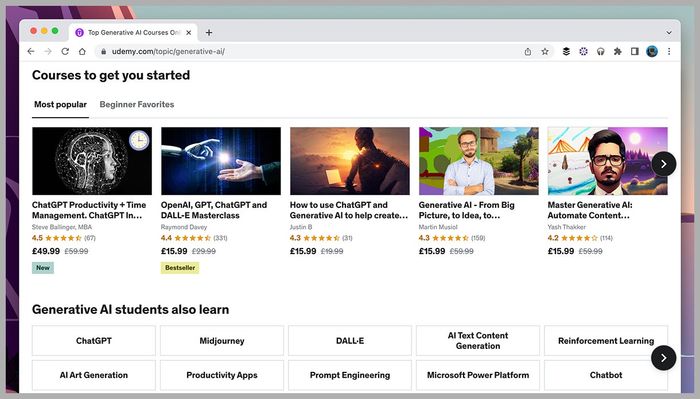 Như bạn mong đợi, cổng thông tin học tập lớn là Udemy có một phần về trí tuệ nhân tạo sáng tạo đang mở rộng nhanh chóng. Những khóa học video này bao gồm nhiều chủ đề và mức giá, và mặc dù bạn không thể thử nghiệm chúng miễn phí, bạn có thể xem qua đánh giá từ người dùng khác và được hoàn tiền nếu bạn không hài lòng.