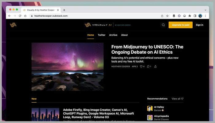 Một nguồn lực Substack khác, Trực Quan Trí Tuệ Nhân Tạo là một dự án của tác giả Heather Cooper. Nó cho bạn biết những gì có sẵn trong các công cụ trí tuệ nhân tạo sáng tạo và giúp bạn tận dụng chúng—cho dù đó là về văn bản, hình ảnh hoặc bất kỳ thứ gì khác mà trí tuệ nhân tạo có thể tạo ra.
