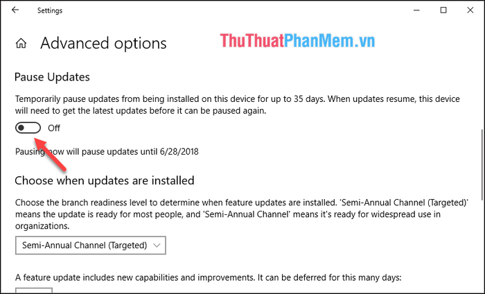 Step 4: In the Advanced options window, scroll down to Pause Updates and switch the toggle from Off to On.