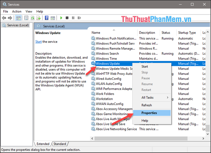 Step 2: In the Services window, locate the Windows Update item, then right-click and choose Properties.