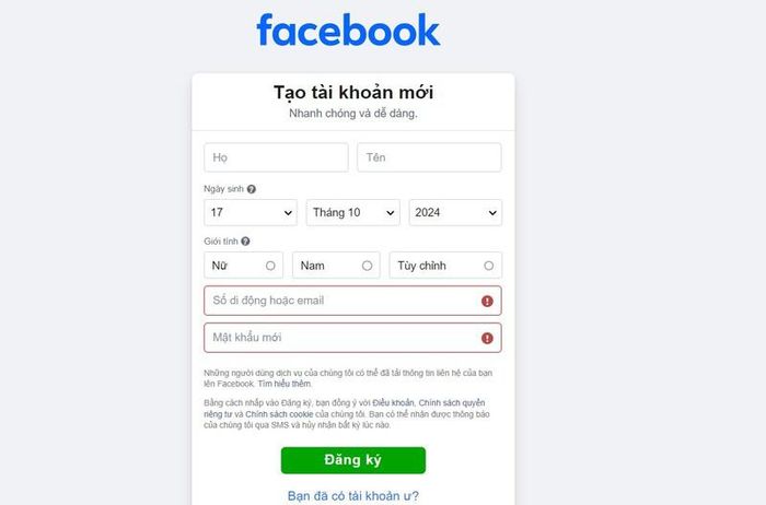 Bước 2: Điền đầy đủ thông tin theo yêu cầu của Facebook. Các thông tin cá nhân có thể không cần trùng khớp với giấy tờ chính thức. Bạn có thể sử dụng số điện thoại từ sim rác hoặc một địa chỉ email mới để đăng ký.