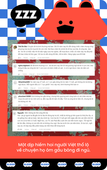 Có lẽ, đây là một dịp hiếm hoi người Việt thổ lộ về việc họ ôm gấu bông khi đi ngủ. Tại Mỹ, một khảo sát đã thực hiện và phát hiện ra rằng khoảng 40% người trưởng thành vẫn giữ những người bạn nhỏ nhồi bông trên giường. Con số tại Anh là 34%.
