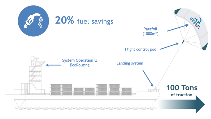 Bay động đất trên 200m trên mặt nước biển, Seawing là một cánh dù parafoil 1000m2 được thiết kế để tận dụng sức gió đẩy tàu vận chuyển, giảm tiêu thụ nhiên liệu và phát thải từ 10% đến 40%.